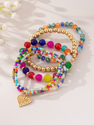 This colorful and gold bracelet stack adds a playful touch to any outfit. With vibrant hues and a touch of shimmering gold, this bracelet stack is perfect for adding some fun and chic flair to your style. Handcrafted with high-quality materials, it is a must-have accessory for any fashionista.