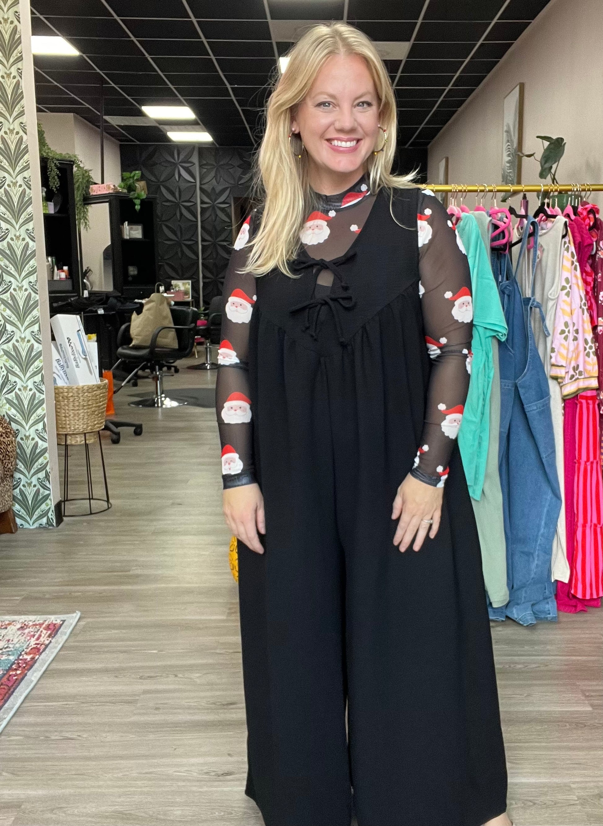 Playful sheer mesh mockneck with Santa print. Perfect for layering under dresses, sweaters, and graphic tees for a festive pop.
