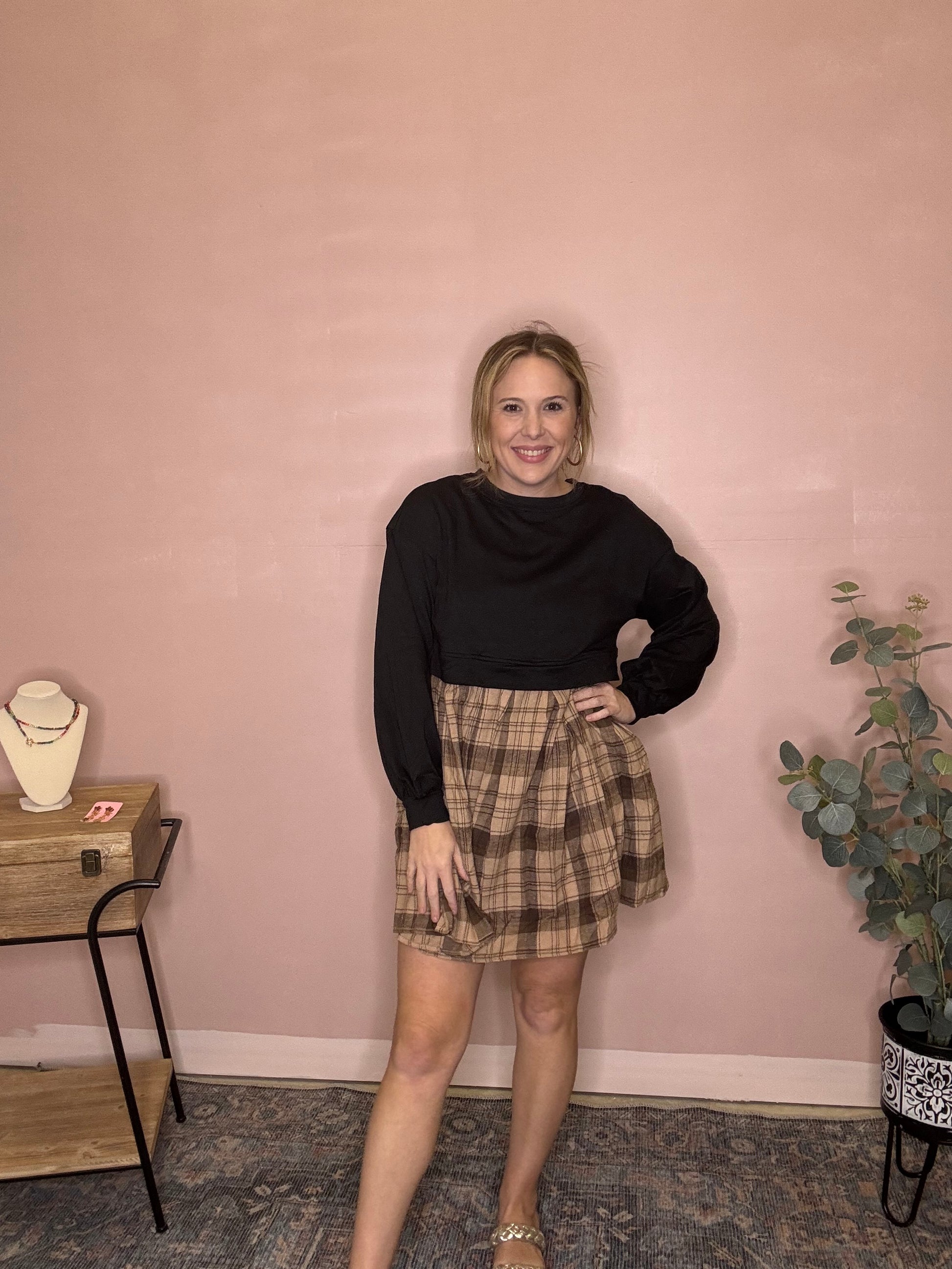 Neutral plaid mini sweater dress — comfy, cute, and flattering for fall outings. ☕