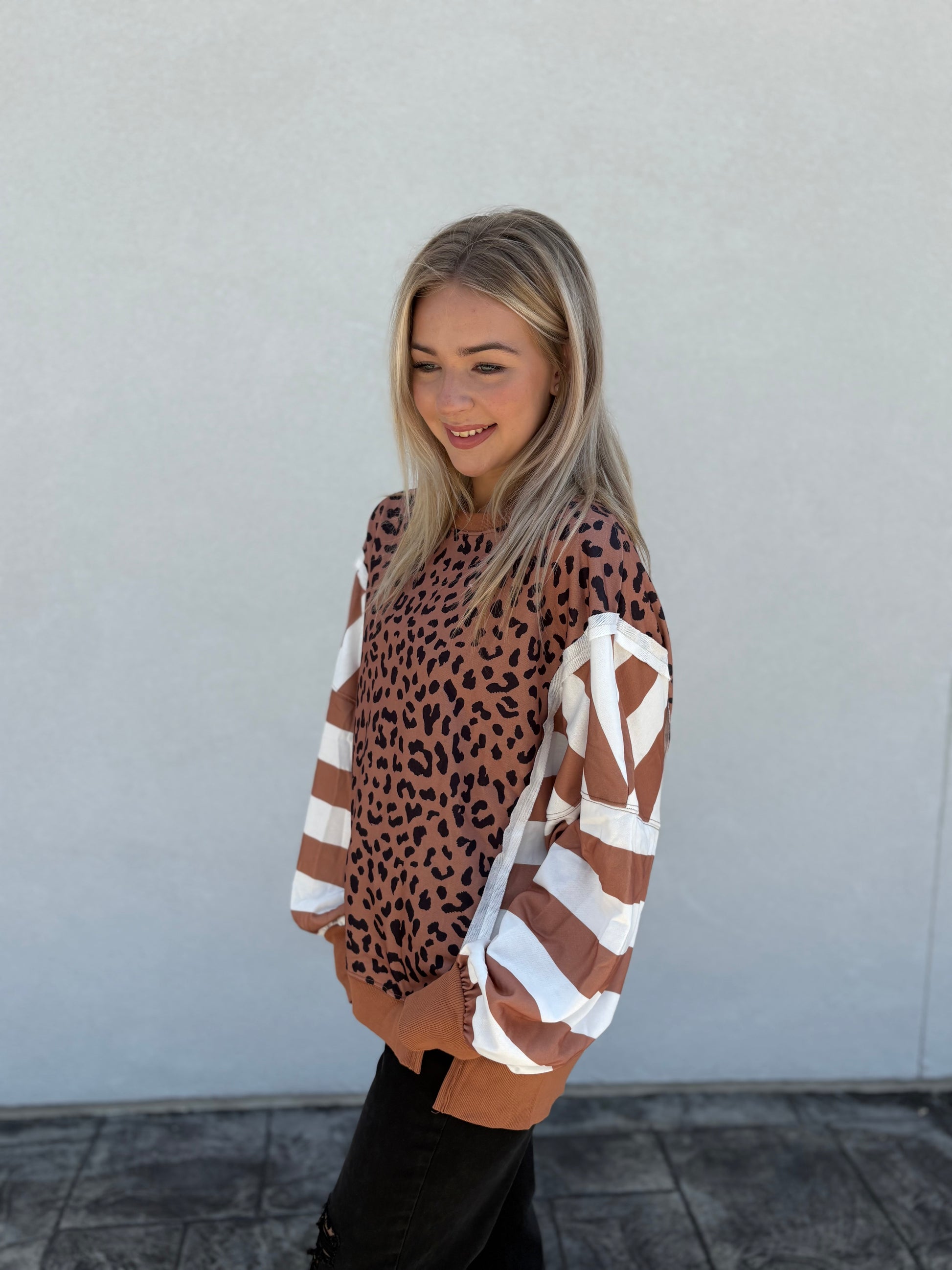 Stand out in cozy style with this bold patchwork sweatshirt. Featuring a rich brown leopard print front paired with contrasting striped balloon sleeves, it’s the perfect blend of chic and playful. The relaxed fit and soft knit fabric make it an easy throw-on for game days, coffee runs, or casual nights out.